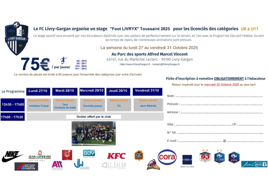 Le FC Livry-Gargan organise un stage pendant les vacances de la Toussaint destiné à nos licenciés U8, U9, U10 et U11. L’occasion pour nos jeunes footballeurs de progresser en s’amusant sur une semaine de foot encadrée par nos éducateurs diplômés !